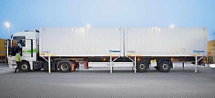 2020 wurde die maximal zulässige Gesamtlänge der Fahrzeugkombination von 17,80 auf 17,88 Meter angehoben. Krone entwickelte den neuen Swap Liner passgenau für zwei Wechselbrücken und ein zulässiges Gesamtgewicht von 40 Tonnen. Das Fahrzeug verfügt über einen patentierten Hybridrahmenhals, der mit 85 Millimetern Höhe mehr Ladevolumen ermöglicht, dabei aber die exakte Einhaltung der maximalen Gesamthöhe bewahrt.